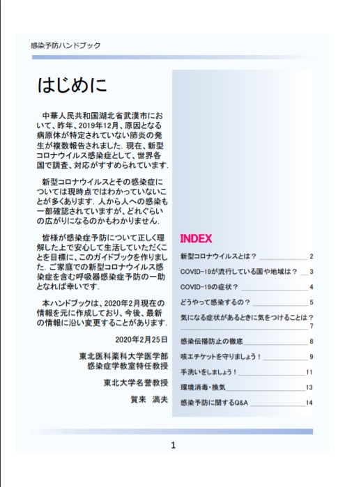新型コロナウイルスに関して 産業医の現場から2020年02月27日掲載 東北医科薬科大学病院から「新型コロナウイルス」について「市民向け感染予防ハンドブック」が発表されています。参考までにお知らせいたします。 新型コロナウイルス感染症~市民向け感染予防ハンドブック~
