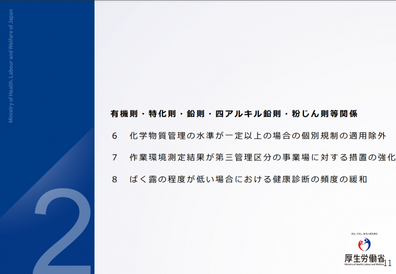 労働安全衛生規則等の一部を改正する省令案概要等 産業医の現場から2022年03月28日掲載 令和4年3月23日、第146回労働政策審議会安全衛生分科会において、労働安全衛生規則等の一部を改正する議題が出ていましたので、お知らせいたします。今後、労働安全衛生規則等の一部が改正されますので、ご留意ください。労働安全衛生規則関係1 事業場における化学物質に関する管理体制の強化2 化学物質の危険性・有害性に関する情報の伝達 の強化3 リスクアセスメントに基づく自律的な化学物質管理の強化4 化学物質の自律的な管理の状況に関する労使等のモニタリング5 化学物質に起因するがんの把握の強化有機則・特化則・鉛則・四アルキル鉛則・粉じん則等関係 6 化学物質 管理の水準が一定以上の場合の個別規制の適用除外 7 作 業 環境測定結果が第三管理区分の事業場に対する措置の強化 8 ばく露の程度が低い場合における健康診断の頻度の緩和石綿障害予防規則第三条第四項の規定に基づき厚生労働大臣が定める者関係1 船舶の事前調査を適切に実施するために必要な知識を有する者2 受講資格3 講師要件4 その他(一部科目の免除等、施行日)個人事業者等の保護に関する労働安全衛生規則等の改正 労働安全衛生規則等の一部を改正する省令案概要等 個人事業者等の保護に関する労働安全衛生規則等の改正事項(追加分) 石綿障害予防規則第三条第四項の規定に基づき厚生労働大臣が定める者 第146回労働政策審議会安全衛生分科会(資料)