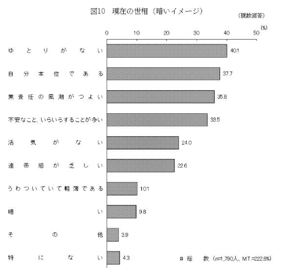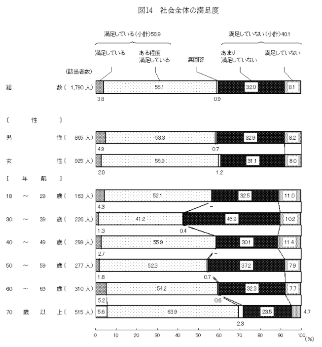 「社会意識に関する世論調査」結果 お知らせ2022年04月22日掲載 内閣府は3月31日、「社会意識に関する世論調査」結果を発表しましたので、ご紹介いたします。◆社会の満足度(満足していない点) ・現在の社会において満足していない点は何か聞いたところ、「経済的なゆとりと見通しが持てない」を挙げた者の割合が55.5%と最も高く、以下、「若者が社会での自立を目指しにくい」(30.1%)、「働きやすい環境が整っていない」(28.6%)、「女性が社会での活躍を目指しにくい」(27.9%)などの順となっている。(複数回答、上位4項目) ・性別に見ると、「女性が社会での活躍を目指しにくい」を挙げた者の割合は女性で高くなっている。◆社会全体の満足度 ・現在の社会に全体として満足しているか聞いたところ、「満足している」とする者の割合が58.9%(「満足している」3.8%+「ある程度満足している」55.1%)、「満足していない」とする者の割合が40.1%(「あまり満足していない」32.0%+「満足していない」8.1%)となっている。 都市規模別に見ると、大きな差異は見られない。 ・年齢別に見ると、「満足している」とする者の割合は70歳以上で、「満足していない」とする者の割合は30歳代で、それぞれ高くなっている。 「社会意識に関する世論調査」結果
