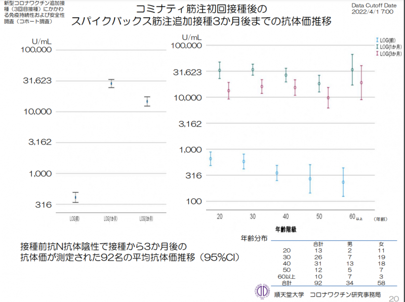 新型コロナワクチンの追加接種後の健康状況調査 お知らせ2022年04月20日掲載 厚生労働省より、新型コロナワクチンの追加接種(3回目接種)後の健康状況調査結果が発表されていましたので、お知らせいたします。◆初回接種:ファイザー社、追加接種:ファイザー社の新型コロナワクチン・中間報告の抜粋 抗体価について、487人の結果を集計しました。集計の結果、追加接種前幾何平均抗体価は386U/mL、追加接種から28日後の幾何平均抗体価は19,771U/mL、幾何平均抗体価倍率は51.2倍でした。・追加接種から3か月後の抗体価は、追加接種から1か月後の抗体価と比較すると低下しているものの、その場合でも、追加接種前の抗体価と比較すると約27.4倍でした(440人の結果)。 ◆初回接種:ファイザー社、追加接種:武田/モデルナ社の新型コロナワクチン・中間報告の抜粋 抗体価について、485人の結果を集計しました。集計の結果、追加接種前幾何平均抗体価は454U/mL、追加接種から28日後の幾何平均抗体価は29,422U/mL、幾何平均抗体価倍率は64.8倍でした。 ・追加接種から3か月後の抗体価は、追加接種から1か月後の抗体価と比較すると低下しているものの、その場合でも、追加接種前の抗体価と比較すると約36.0倍でした(92人の結果)。 新型コロナワクチンの追加接種後の健康状況調査
