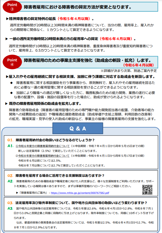 障害者の法定雇用率の引き上げ等に関するリーフレット/厚生労働省 お知らせ2023年05月01日掲載 厚生労働省は、障害者の法定雇用率の引き上げや支援策強化に関するリーフレット(3月1日付)を公表しているので、ご紹介します。 障害者の法定雇用率の引き上げ等に関するリーフレット