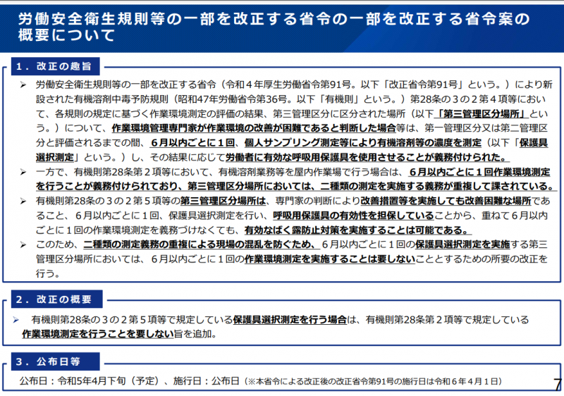 第153回労働政策審議会安全衛生分科会(資料) お知らせ2023年06月05日掲載 第153回労働政策審議会安全衛生分科会(3月28日開催)にて、下記の内容が公表されていましたので、お知らせいたします。資料1-1 有機溶剤中毒予防規則等の一部を改正する省令案要綱資料1-2 有機溶剤中毒予防規則等の一部を改正する省令案の概要資料2-1 労働安全衛生規則等の一部を改正する省令の一部を改正する省 令案要綱資料2-2 労働安全衛生規則等の一部を改正する省令の一部を改正する省令案の概要資料3 作業環境測定基準及び第三管理区分に区分された場所に係る有機溶剤等の濃度の測定の方法等の一部を改正する告示について(報告)資料4 労働安全衛生規則第五百七十七条の二第二項の規定に基づき厚生労働大臣が定める物及び厚生労働大臣が定める濃度の基準等について(報告)資料5 石綿障害予防規則の改正に伴う関連告示の改正について(報告)資料6 事業場における労働者の健康保持増進のための指針(THP指針)の改正について(報告)資料7 デジタル原則に照らした規制の一括見直しプラン及びデジタル原則を踏まえたアナログ規制の見直しに係る工程表を踏まえた対応等の報告について(報告)参考資料6 事業場における労て働者の健康保持増進のための指針(THP指針)の改正について 第153回労働政策審議会安全衛生分科会(資料)