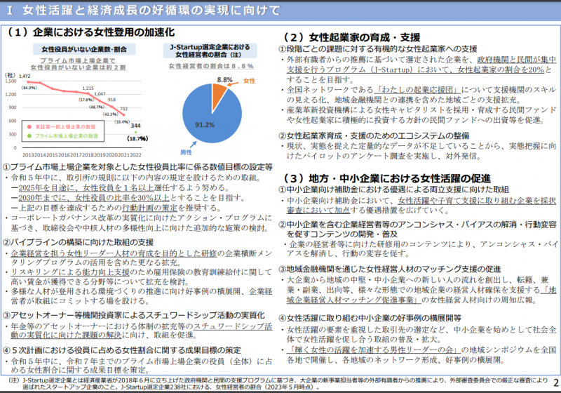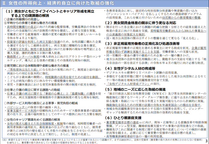 政府は6月5日、男女共同参画会議を開き、「女性活躍・男女共同参画の重点方針2023(女性版骨太の方針2023)」(原案)を示しましたので、ご紹介いたします。