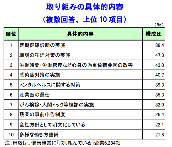 健康経営への取り組みに対する企業の意識調査 お知らせ2023年11月20日掲載 株式会社帝国デ-タバンクから「健康経営への取り組みに対する企業の意識調査」が公表されていましたので、ご紹介いたします。調査結果(要旨)1. 健康経営に取り組んでいる企業は 56.9%、従業員数が多いほど高く2. 具体的内容、「定期健康診断の実施」が 9 割、「職場の喫煙対策の実施」も 5 割3. 取り組んでいない理由、「適当な人材確保が困難」が 39.0%でトップ4. 企業の 21.0%でメンタルヘルス不調の従業員あり、過重労働時間も 1 割超5. 導入したい健康保持サービス、「健診結果のデータ化・管理、分析」が 25.5%でトップ 健康経営への取り組みに対する企業の意識調査