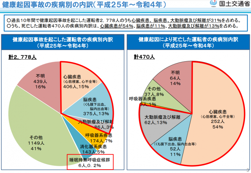 国土交通省は2月7日に開催した「事業用自動車健康起因事故対策協議会」で、健康状態に起因する事故報告件数や、バス・タクシー・トラック事業者に対する健康起因事故防止の取り組みに関するアンケート調査結果を公表していましたので、ご紹介いたします。