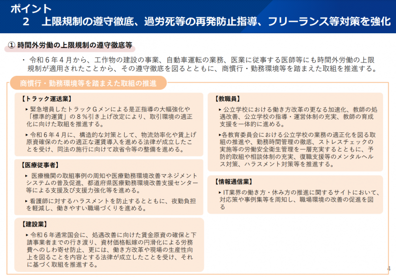 2. 令和6年4月から全面適用された時間外労働の上限規制の遵守を徹底、過労死等を繰り返し発生させた企業に改善計画を策定させるなど再発防止の指導を強化