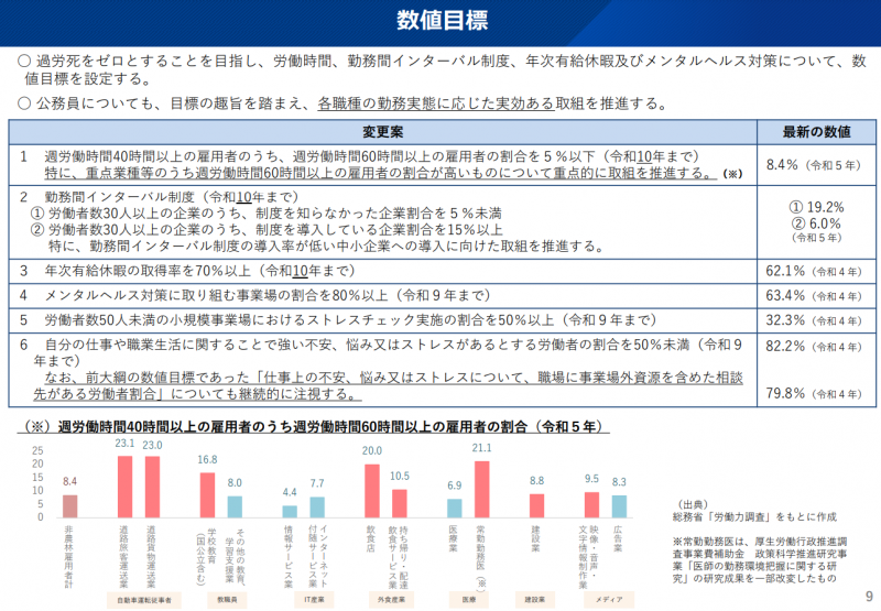 厚生労働省では、令和5年11月から今年6月にかけて4回にわたり「過労死等防止対策推進協議会」を開催し、「過労死等の防止のための対策に関する大綱」(以下、「大綱」という。)の見直し案をまとめましたので、ご紹介いたします。
