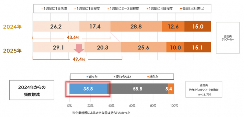 テレワークに関する調査 お知らせ2025年11月03日掲載 パーソル総合研究所より「テレワークに関する調査」結果が発表されていましたので、ご紹介いたします。・テレワーク実施率は22.5%、2024年同期比からほぼ横ばい2025年7月時点のテレワークの実施率は、正規雇用社員(以下、正社員)22.5%。2024年同時期の22.6%とほぼ横ばい。2023年以降、全体的なテレワーク実施率は安定的な定着傾向を見せている。・テレワークの頻度は減少傾向テレワーカーのテレワーク頻度は、「1週間に1日未満」が29.1%、「1週間に1日程度」が20.3%。2024年と比較すると、「週に1日以下」のテレワーカーが43.6%から49.4%に増え、テレワーク頻度の全体は減少傾向。・原則出社の指示がでている大手企業が増加テレワークについての企業方針(従業員回答)は、62.2%が「特に会社から指示は無い」。2024年と比較すると全体的に「原則出社の指示」が微増。特に企業規模10,000人以上の会社が24.4%で、2024年の20.8%から増加した。・テレワーク実施率が高い職種はコンサルタント職種別にテレワーク実施率を見ると、「コンサルタント(62.2%)」「IT系技術職(58.3%)」が高い。・テレワーク継続希望率は82.2%で過去最高テレワーク実施者に、今後のテレワーク希望を聴取した。「続けたい」計は82.2%と過去最高。2020年後半以降、高止まりの状態が続いている。・部下の仕事の様子がわからなくなった上司が増加傾向テレワークに関する困りごとは、「運動不足を感じる」が55.4%と最上位だが、全体的に減ってきている。「部下の仕事の様子がわからなくなった」(上司のみ回答)だけが、ここ2年で増加傾向。 第十回・テレワークに関する調査